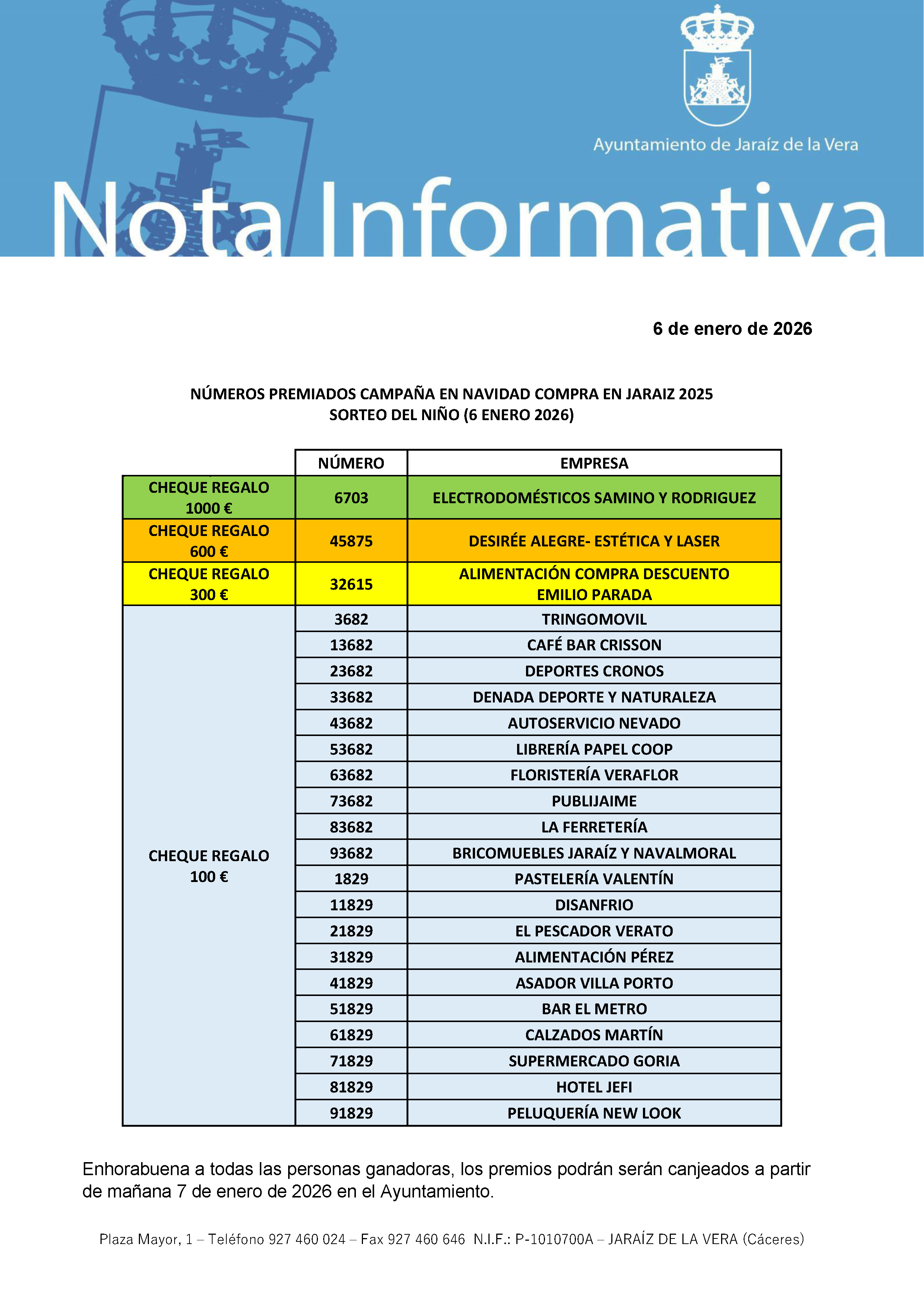 Enhorabuena a todas las personas ganadoras, los premios podrán serán canjeados a partir de mañana 7 de enero de 2026 en el Ayuntamiento.
