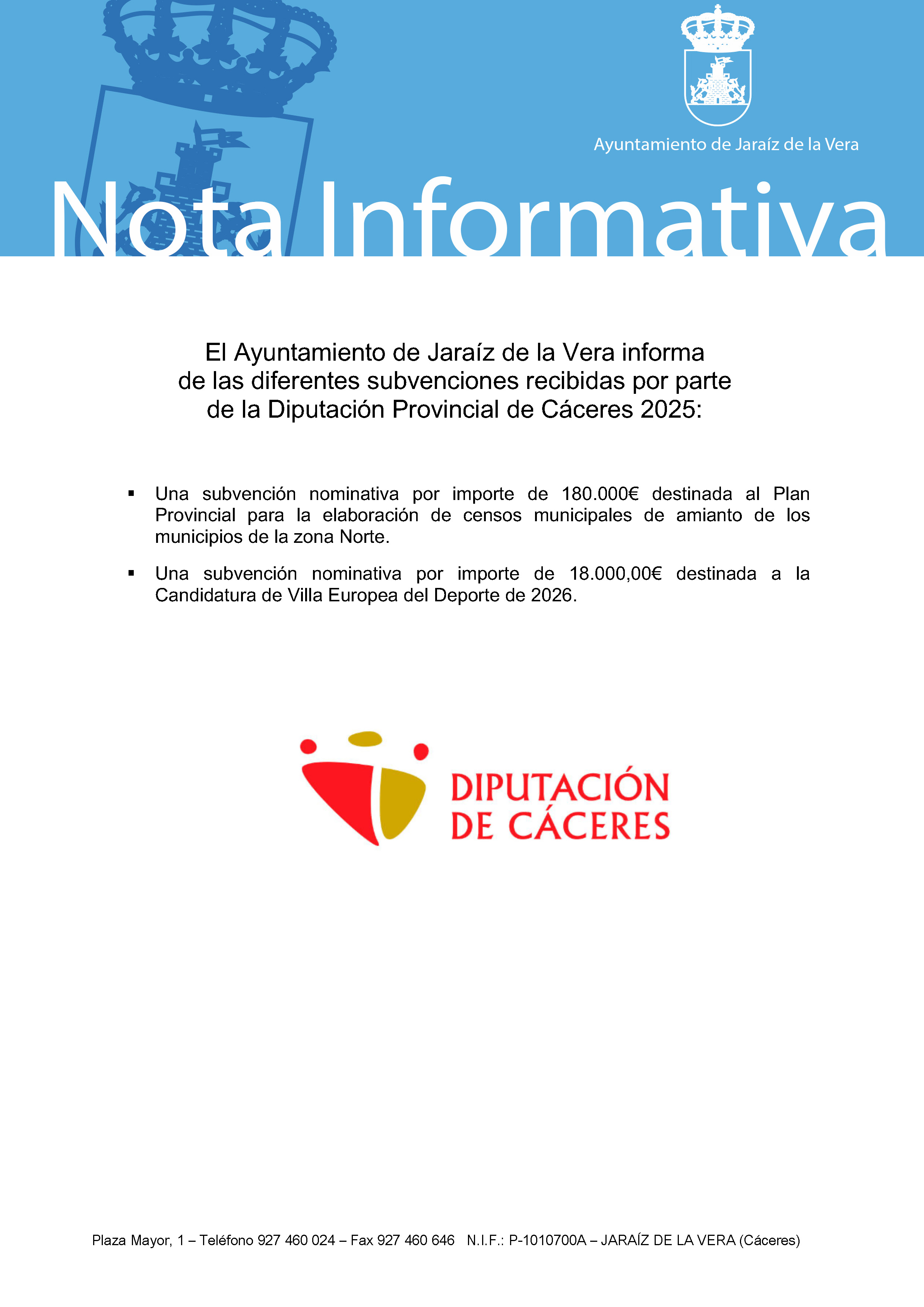 Subvenciones recibidas por parte de Diputación de Cáceres - 4º Trimestre 2025