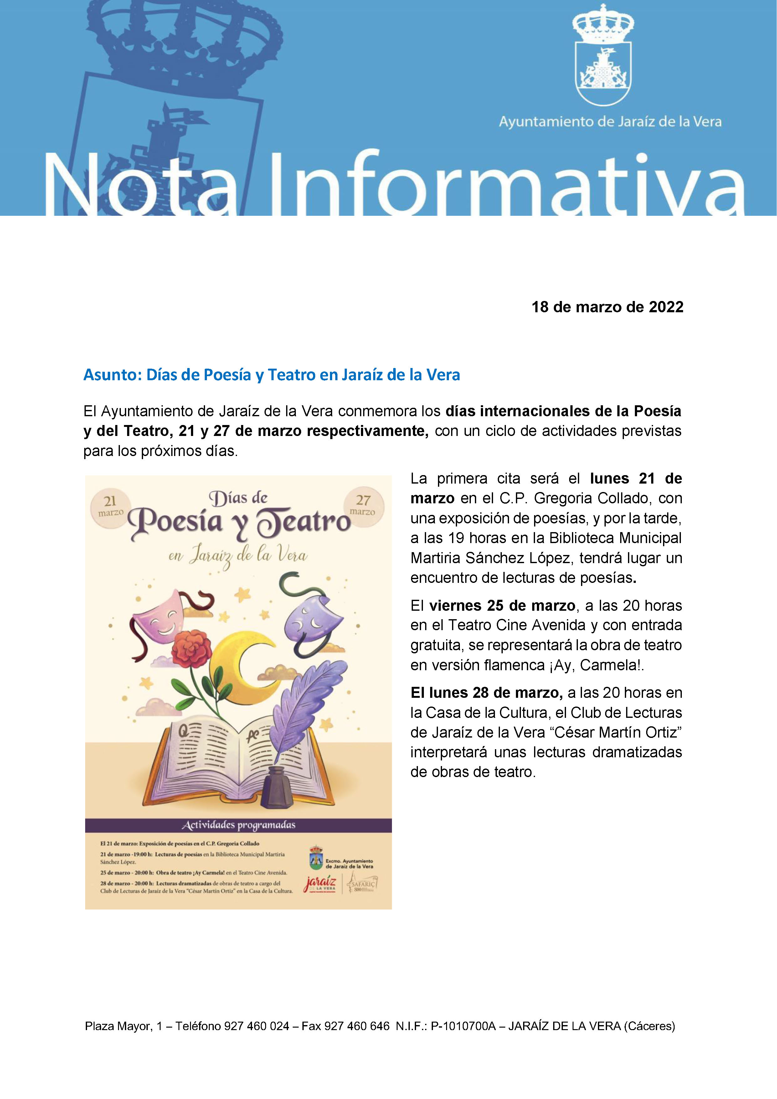 Días de Poesía y Teatro en Jaraíz de la Vera 18 marzo 2022 Galería imágenes Documentos 20220318_nota prensa dias de teatro y poesia.pdf (pdf 221,6 kB)