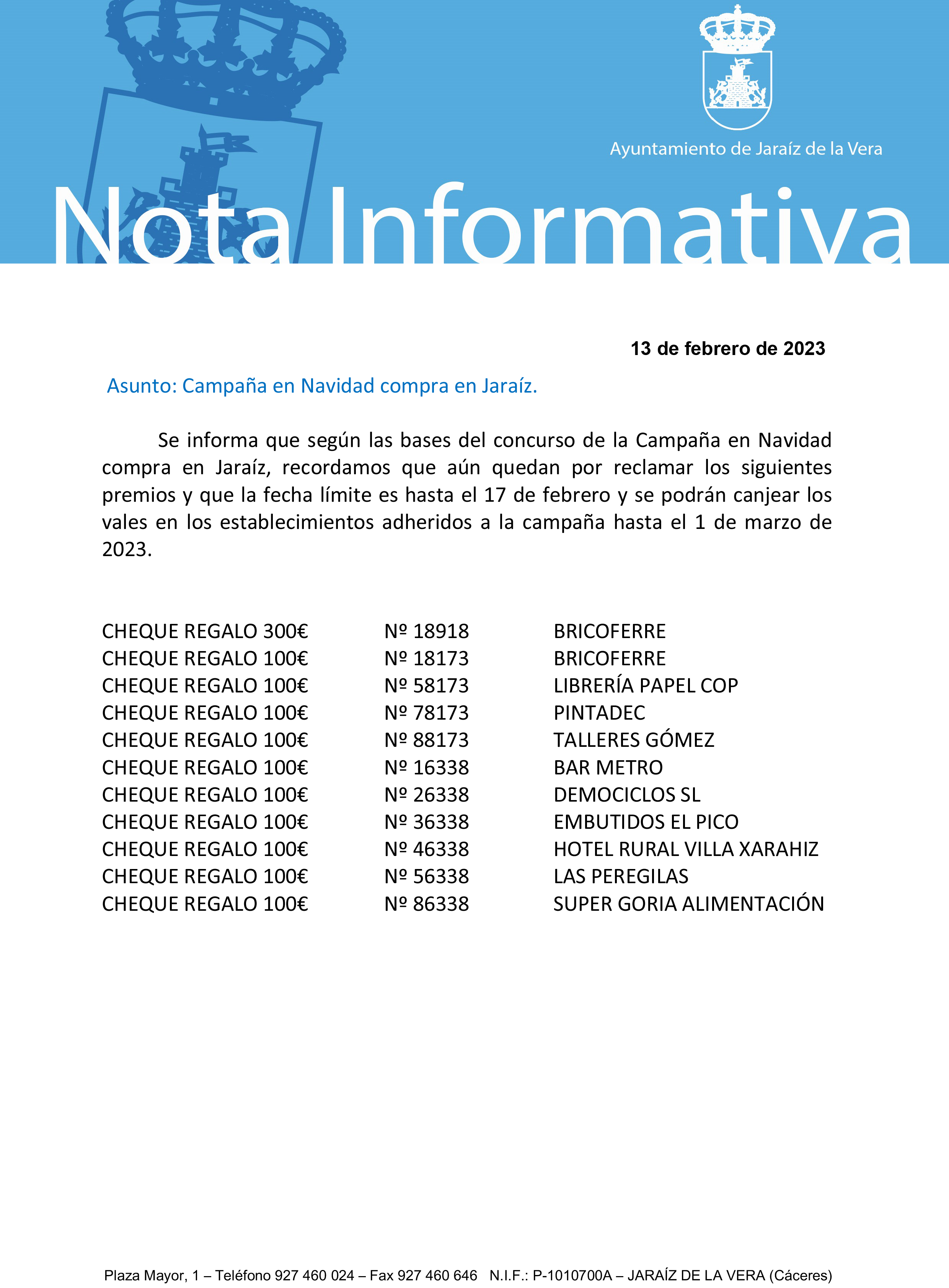 RECORDATORIO DE NÚMEROS PREMIADOS SIN RECLAMAR DE LA CAMPAÑA DE NAVIDAD 13 febrero 2023 Documentos RECORDATORIO CAMPAÑA NAVIDAD 2022.pdf (pdf 591,6 kB)