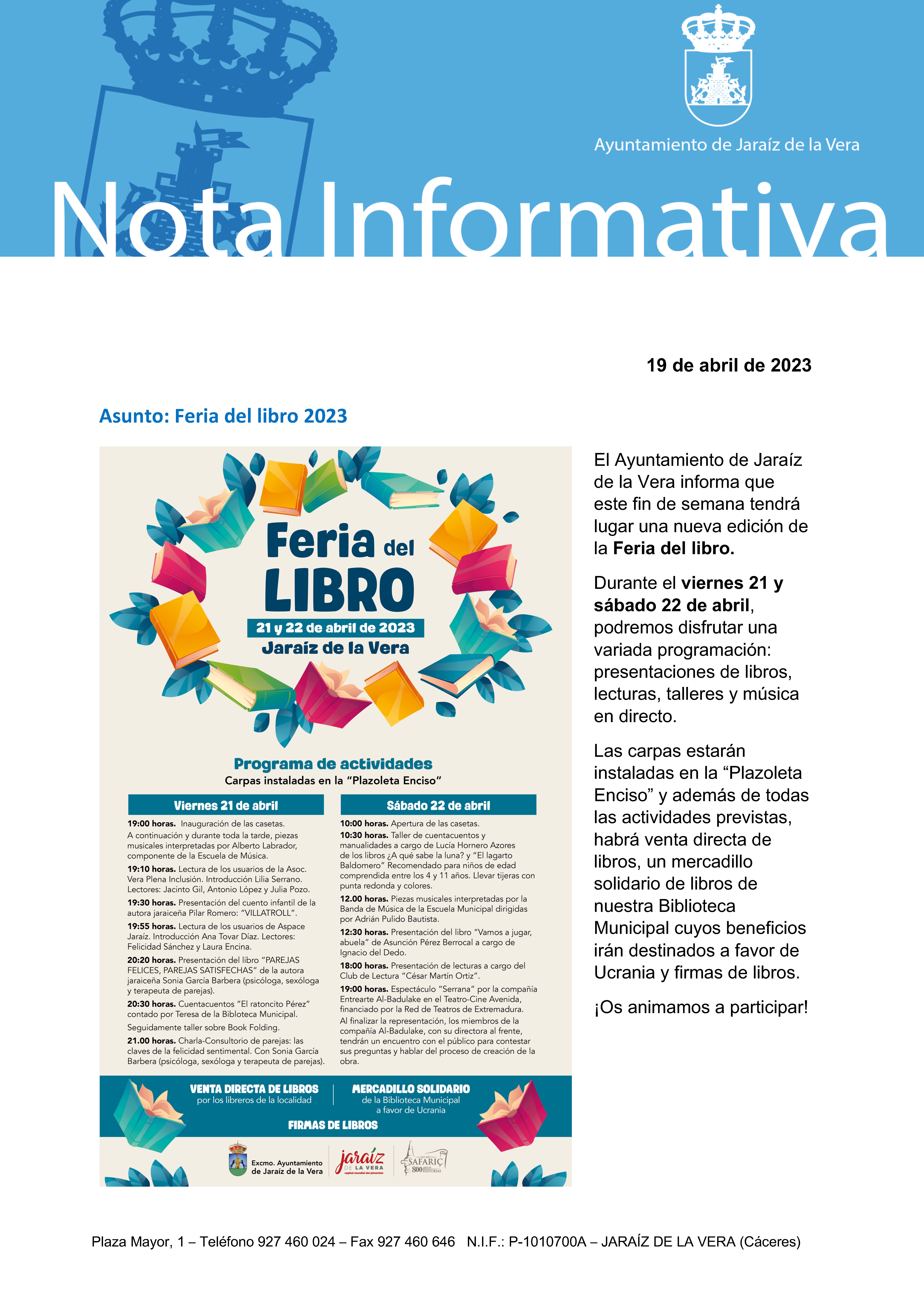 Feria del libro. Durante el viernes 21 y sábado 22 de abril. 21 abril 2023 Documentos 20230419_nota prensa feria del libro 2023.pdf (pdf 3 MB)