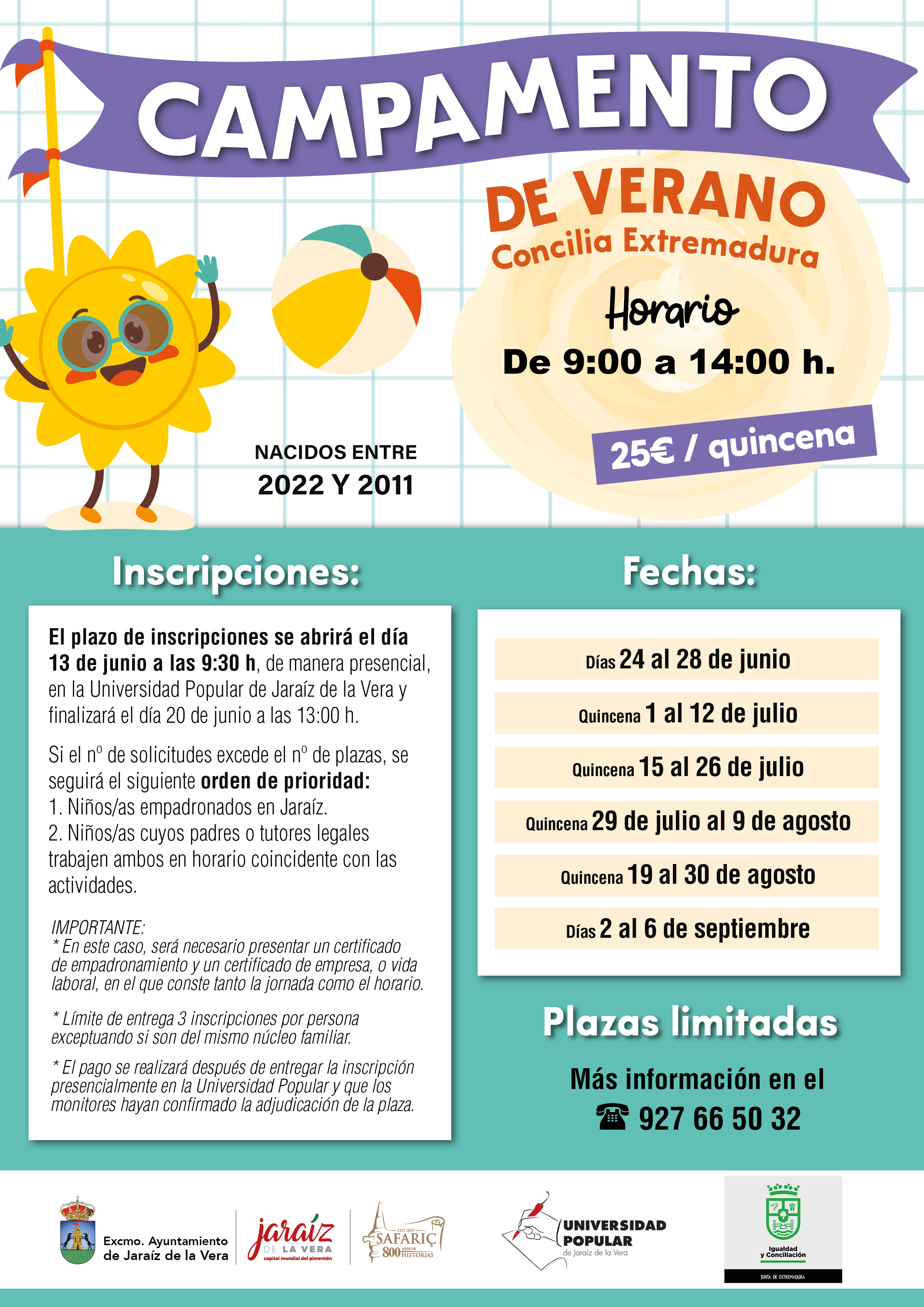 El Ayuntamiento de Jaraíz de la Vera informa que durante todo el verano va a desarrollarse el programa Concilia Extremadura de campamentos de verano, destinado a niños y niñas nacidos entre los años 2022 y 2011, con el fin de facilitar la conciliación de la vida laboral y familiar y que ellos puedan disfrutar del tiempo libre de forma lúdica y educativa.