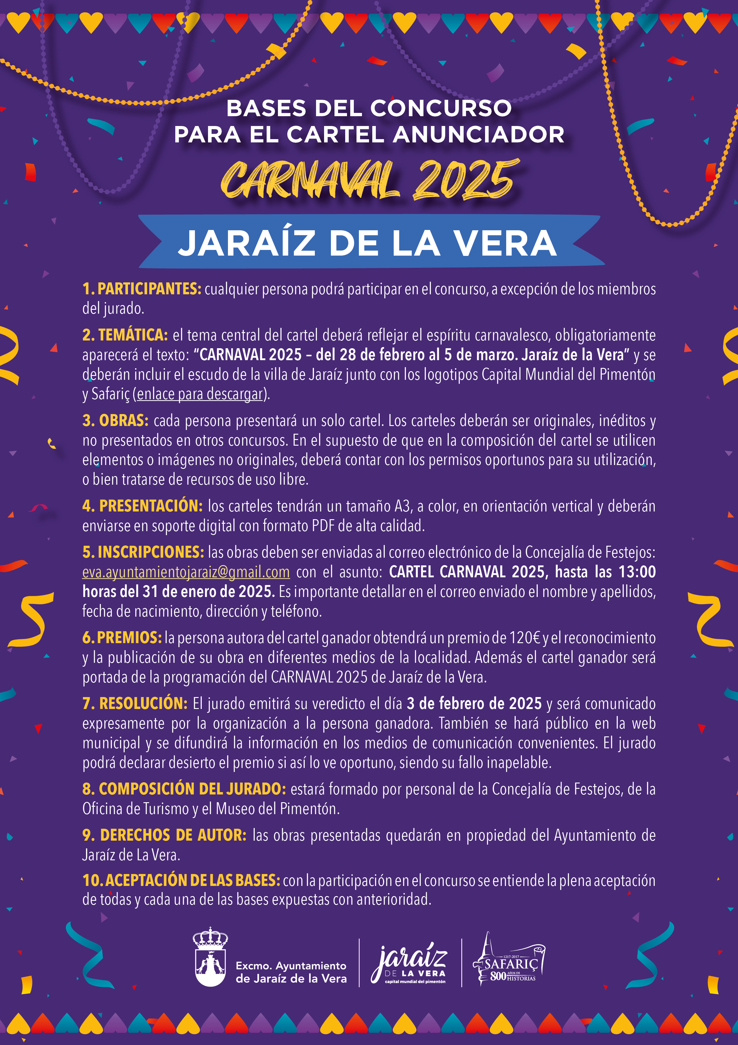 El Ayuntamiento de Jaraíz de la Vera convoca el Concurso para la elección del cartel anunciador del Carnaval 2025 de Jaraíz de la Vera.