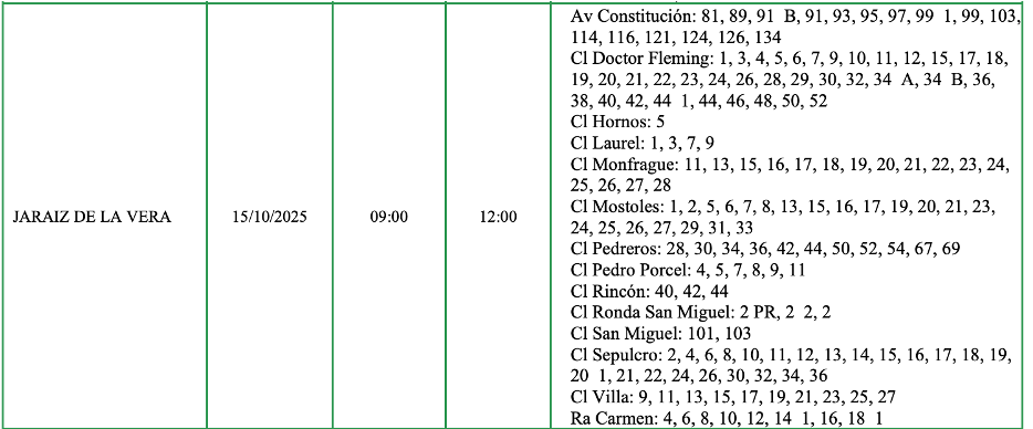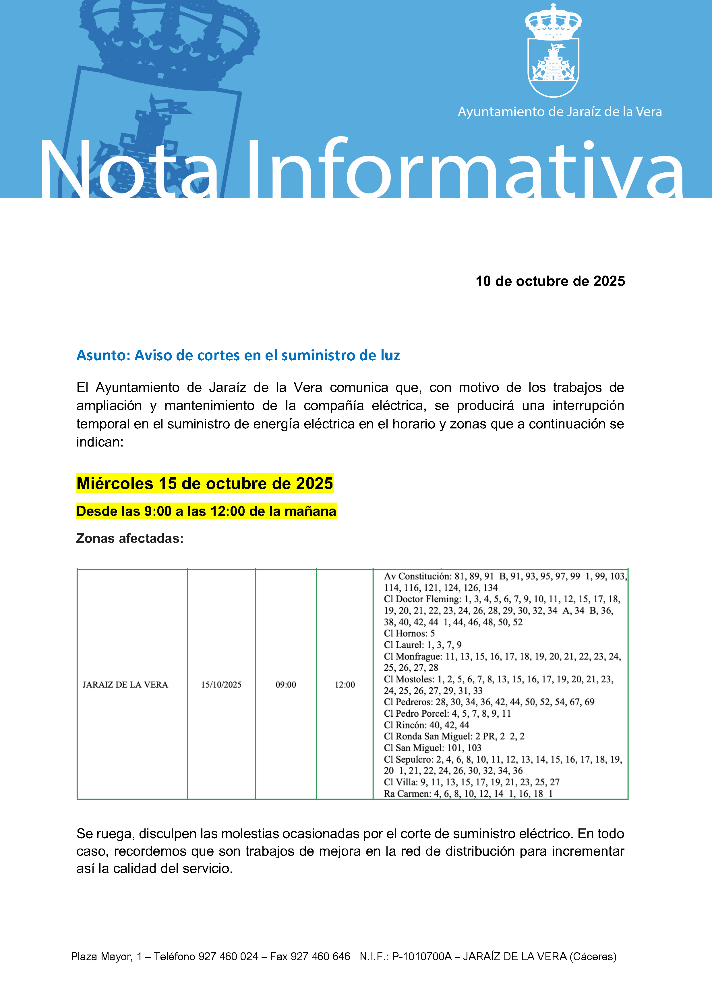 El Ayuntamiento de Jaraíz de la Vera comunica que, con motivo de los trabajos de ampliación y mantenimiento de la compañía eléctrica, se producirá una interrupción temporal en el suministro de energía eléctrica en el horario y zonas que a continuación se indican: