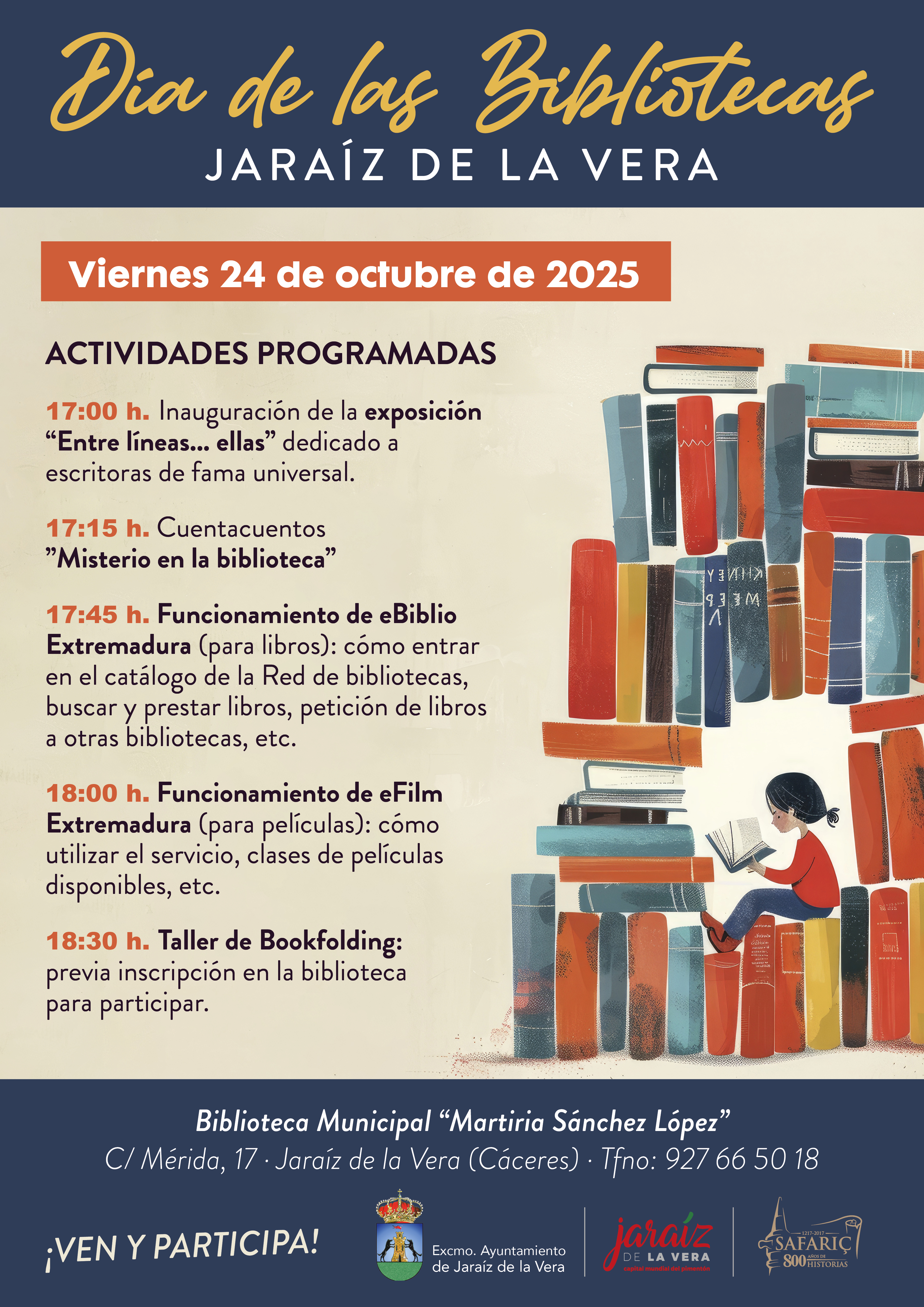 El Ayuntamiento de Jaraíz de la Vera informa que, la Biblioteca Municipal “Martiria Sánchez López” de Jaraíz de la Vera ha organizado para este viernes 24 de octubre, una serie de actividades para celebrar el Día de las Bibliotecas.