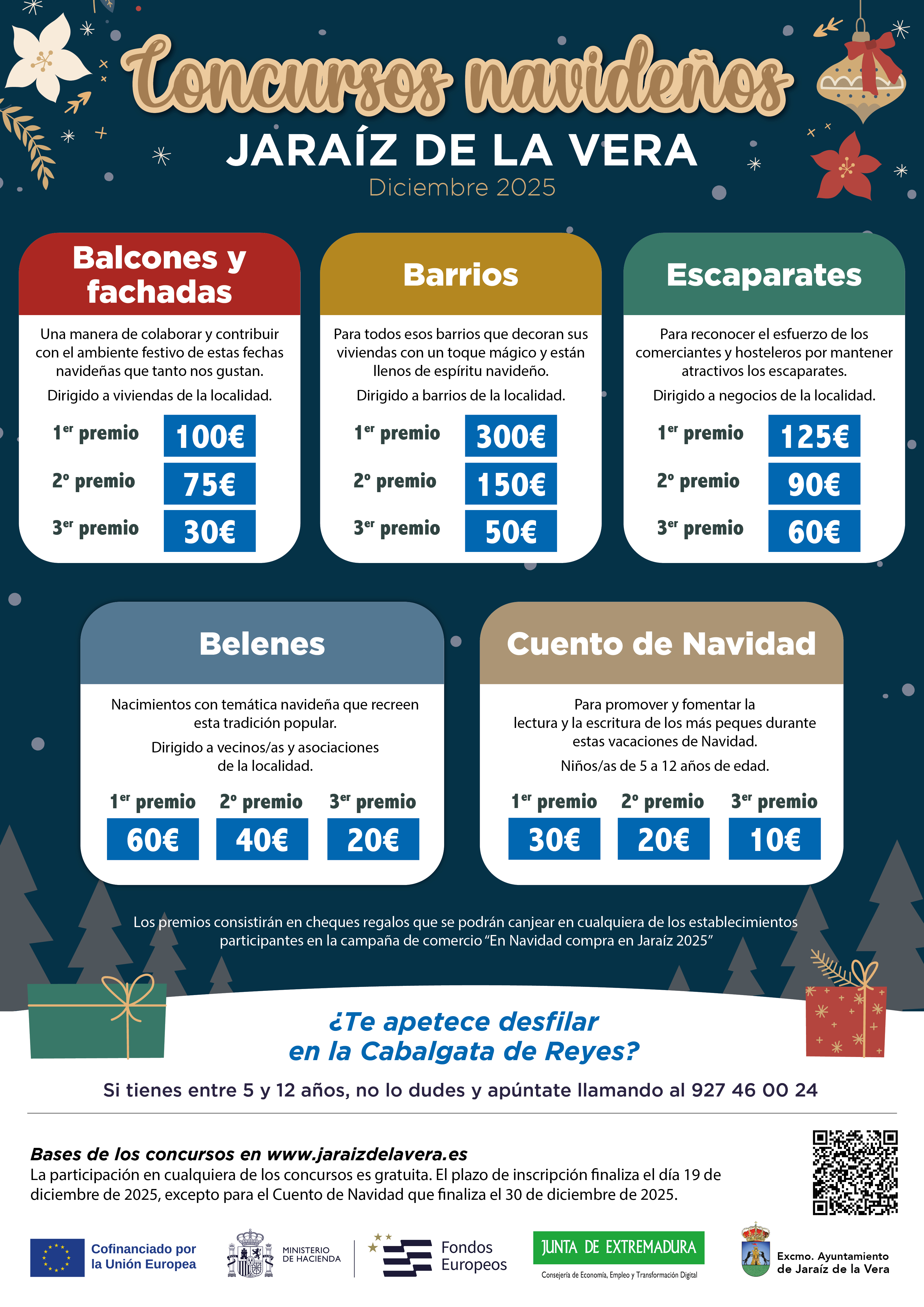 El Ayuntamiento de Jaraíz de la Vera convoca los tradicionales Concurso de Balcones y fachadas, Concurso de Barrios, Concurso de Escaparates, Concurso de Belenes y el Concurso de Cuento de Navidad.