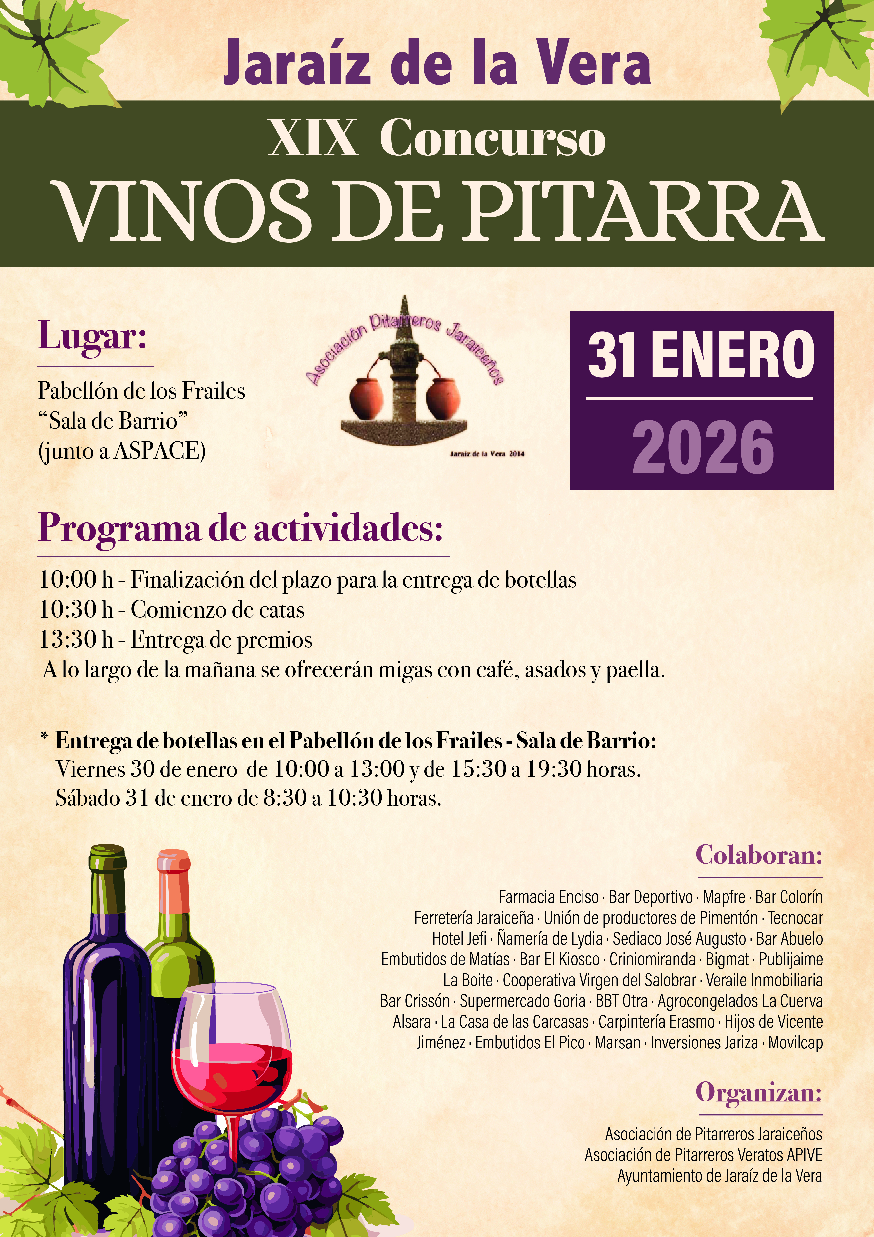 El Ayuntamiento de Jaraíz de la Vera informa que, este sábado 31 de enero, se celebrará el XIX Concurso de vinos de pitarra, organizado por la Asociación de Pitarreros Jaraiceños, la Asociación de Pitarreros Veratos APIVE y el Ayuntamiento de Jaraíz de la Vera.