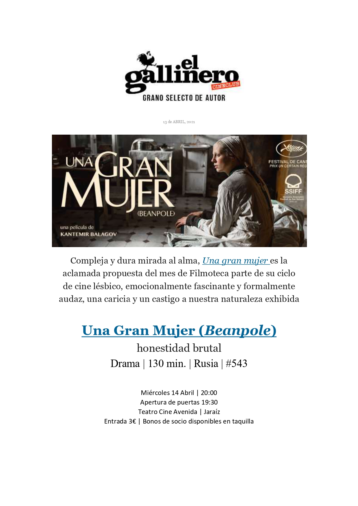 CINE CLUB EL GALLINERO - 14 DE ABRIL 2021