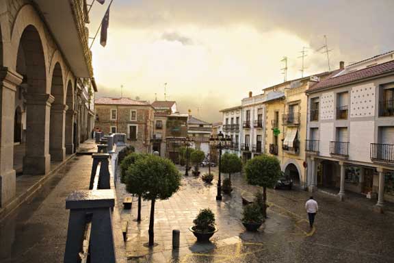 Espectacular plaza especialmente original por su trazado en dos niveles. Es toda porticada, con soportales y columnas de cantería de estilo Renacentista. El Ayuntamiento también del siglo XVI con restauración del Siglo XX. En el nivel inferior de la plaza mayor se sitúa una fuente circular con escudo de la población tallado en piedras y la Casa-Palacio del Obispo Manzano, hoy Museo del Pimentón. En la parte alta, también porticada se celebraban importantes mercados de ganado y venta de producto artesanales, además de ser uno de los puntos de encuentro más importante de la población.