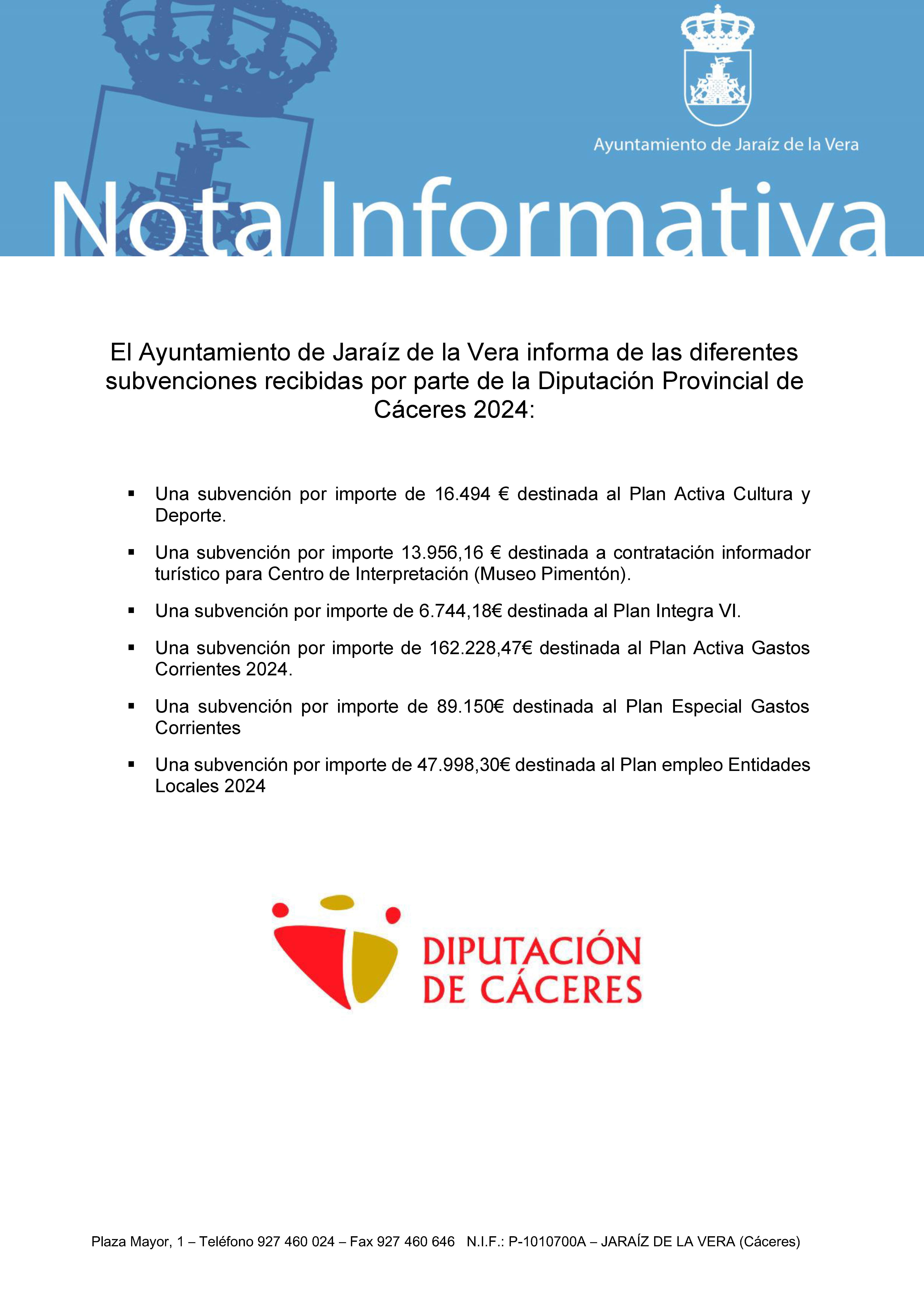 El Ayuntamiento de Jaraíz de la Vera informa de las diferentes subvenciones recibidas por parte de la Diputación Provincial de Cáceres 2024: